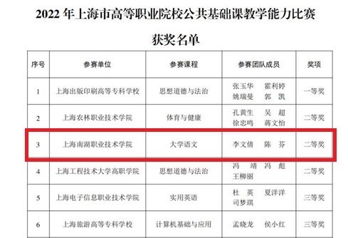 近日,“2022 年上海市高等职业院校公共基础课教学能力比赛”结果向社会公示,来自上海南湖职业技术学院基础教学部的李文倩和陈芬参赛团队凭借“大学语文”课程荣获二等奖。