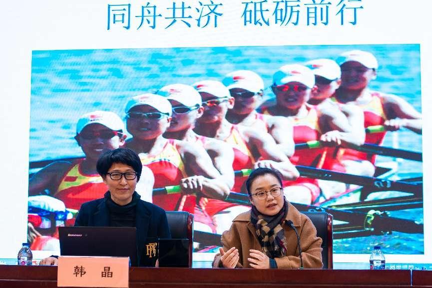 讲座中,同学们观看了中国女子赛艇队夺冠的赛事视频,了解了赛艇相关基本知识。随后,韩晶教练从赛艇运动的起源与国内外发展、自己与赛艇运动的结缘和金牌背后的故事以及赛艇运动精神四个方面,讲述了自己在长达十四年的赛艇生涯中,如何经过教练的培养和自己不懈的努力,在一次次的挫折与失败、失意与坚守中战胜病痛和困难最终成功实现梦想成为世界冠军的历程。