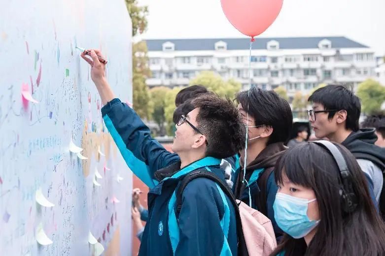 此时,在操场另一边的祝福留言板上,师生们跃跃欲试,纷纷拿起彩笔在板上留下自己的祝语。南湖人将这些点滴的美好汇聚在笔尖,书写于留言板上,一笔一画道不尽对南湖的无限感恩与敬爱,一撇一捺抒发着对同窗友谊的珍重,一字一句展现了对未来的憧憬与期待。