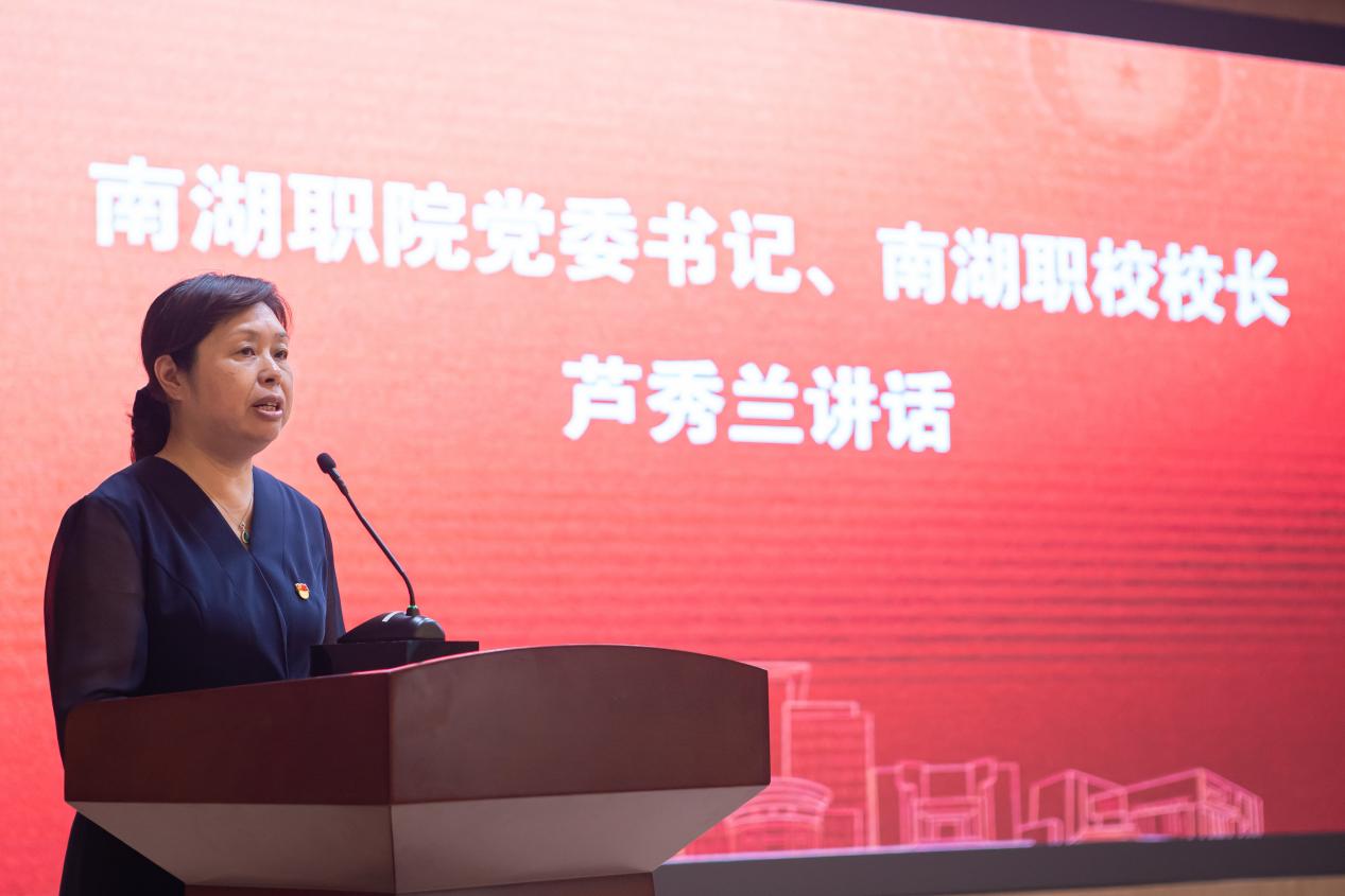 为热烈庆祝中国共产党成立102周年,7月1日下午,上海南湖职业技术学院、上海市南湖职业学校隆重举行2022学年优秀共产党员表彰仪式。南湖职院党委书记、南湖职校校长芦秀兰发表讲话。
