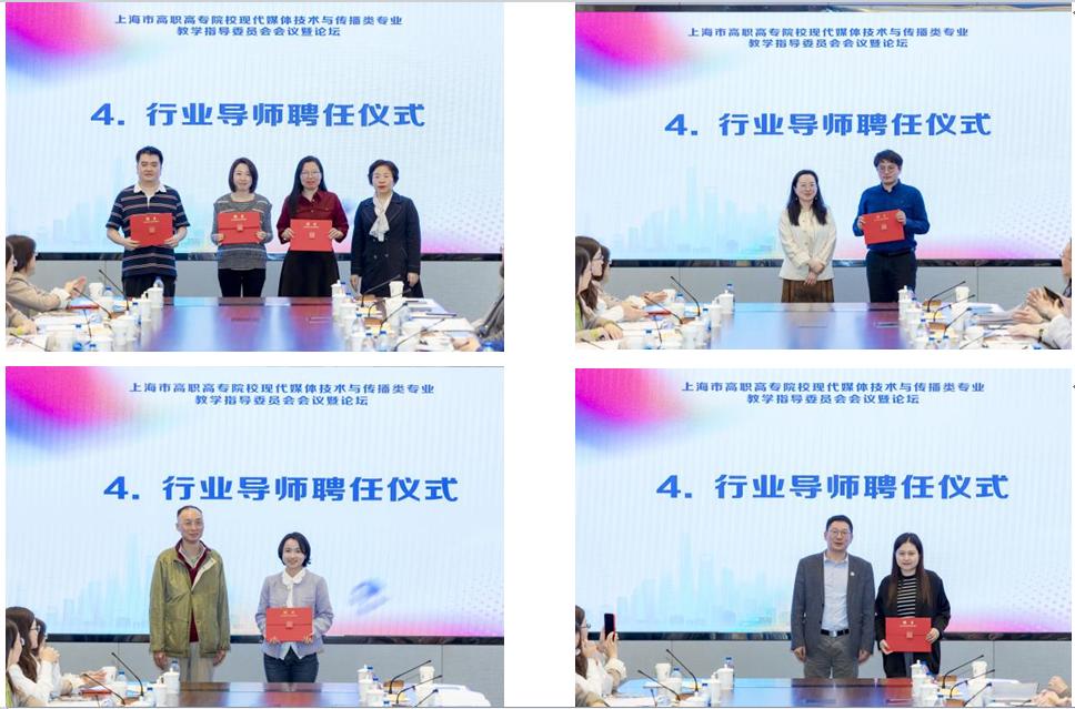 在行业导师聘任仪式上,来自上报集团、上海咪咕视讯科技有限公司、哔哩哔哩股份有限公司、虹口区融媒体中心的六位行业专家被专指委聘为行业导师,朱建柳主任委员和丁燕、钟勇、周一峰等副主任委员为行业导师颁发聘书。
