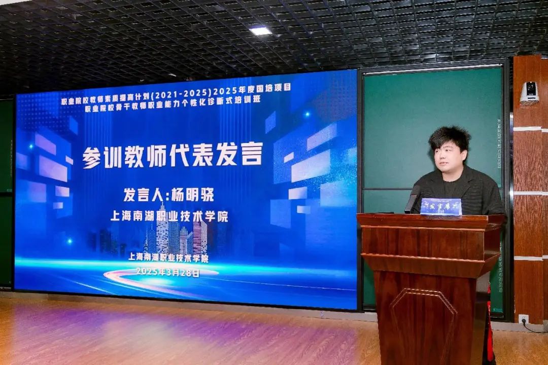 参训教师代表杨明骁在发言中分享了自己作为职业院校专业课教师的思考。在技术飞速发展的当下,以其自身所处的虚拟现实技术领域为例,该技术正深度改变生活与生产方式,这对教师提出了更高要求,不仅要提升理论素养、强化实践能力,还得创新教学方法,如此才能培育出契合时代需求的高素质技术技能人才。他提到技术革新带来的人才需求变化让教师们感到焦虑,而本次培训恰如一场及时雨,其“个性化诊断”理念能为教师定制成长方案,还能通过多种培训形式助力教师发展。杨明骁代表全体参训教师表态,会满怀热情学习,认真完成任务;带着问题学习并转化成果;珍惜交流机会,与同行共同进步。
