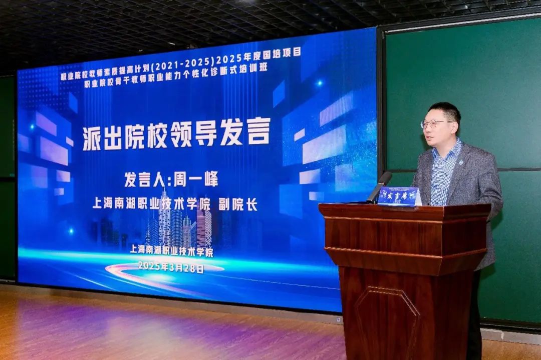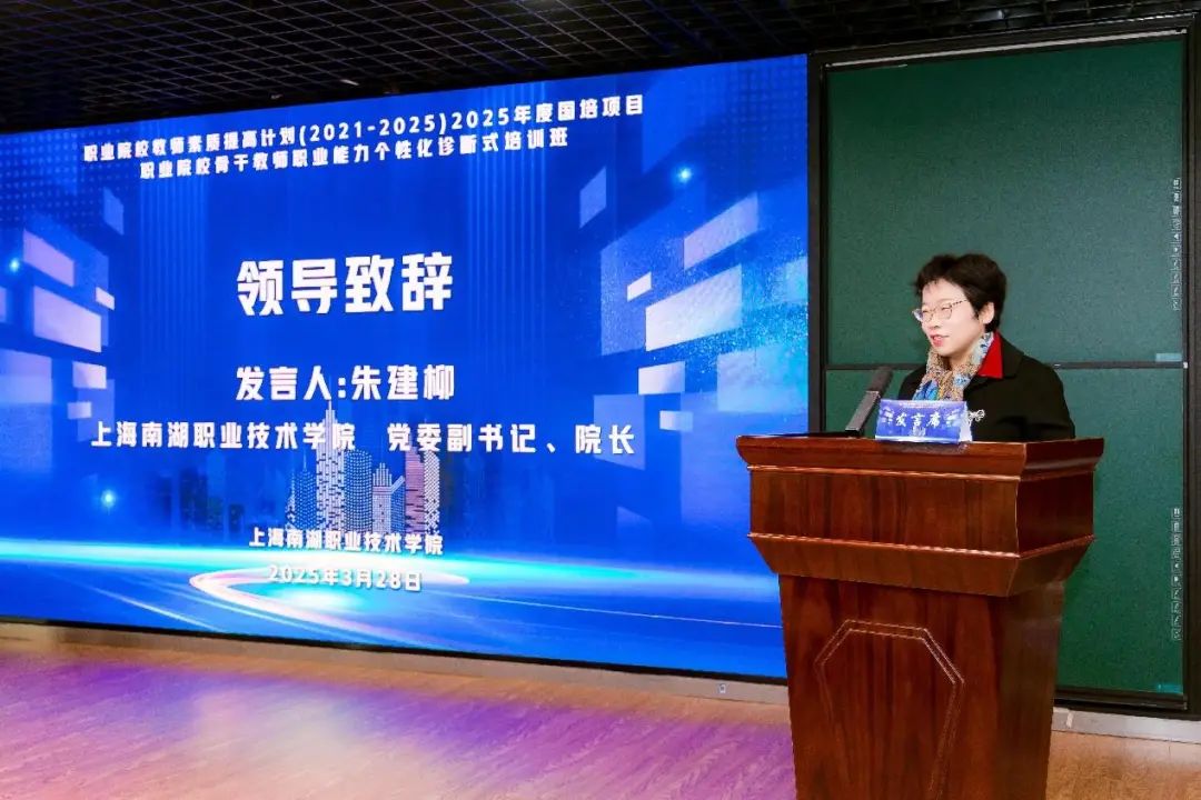 上海南湖职业技术学院党委副书记、院长朱建柳率先发表欢迎致辞。朱院长着重指出,本次培训紧密围绕“职业教育提质培优行动计划(2023-2025)”的收官任务,精准聚焦“数字化转型”与“产教科深度融合”两大战略方向,精心构建“筑基诊断优化”进阶式培养框架,并创新性地运用“云端预诊、现场问诊、联合会诊”三阶诊断法,旨在为教师提供更为精准、高效的能力提升赋能。朱院长殷切期望参训教师能够以“空杯心态”全身心投入到学习中,勇于突破固有思维,积极创新实践,切实将培训所学成果转化为校本创新实践的强大动力,为推动上海职业教育迈向高质量发展贡献力量。