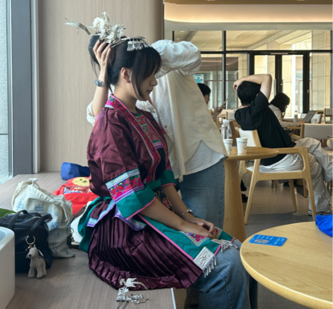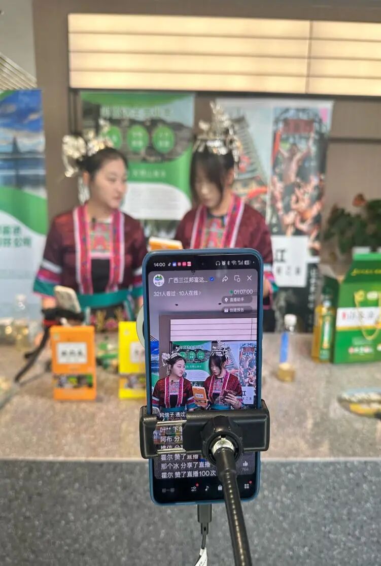 直播间内,来自广西三江的牛肉干、山茶油、黄金罗汉果等农特产品琳琅满目。同学们将侗族特色文化融入销售环节,身着民族风情服饰,打造了一场“以农助旅,以旅兴农”的直播体验。这种融合文旅传播与电商销售的策划,不仅提升了产品的文化附加值,更提升了客户的观看体验,让广大网友在“云端”领略侗寨魅力的同时,心甘情愿为优质农产品“下单”。