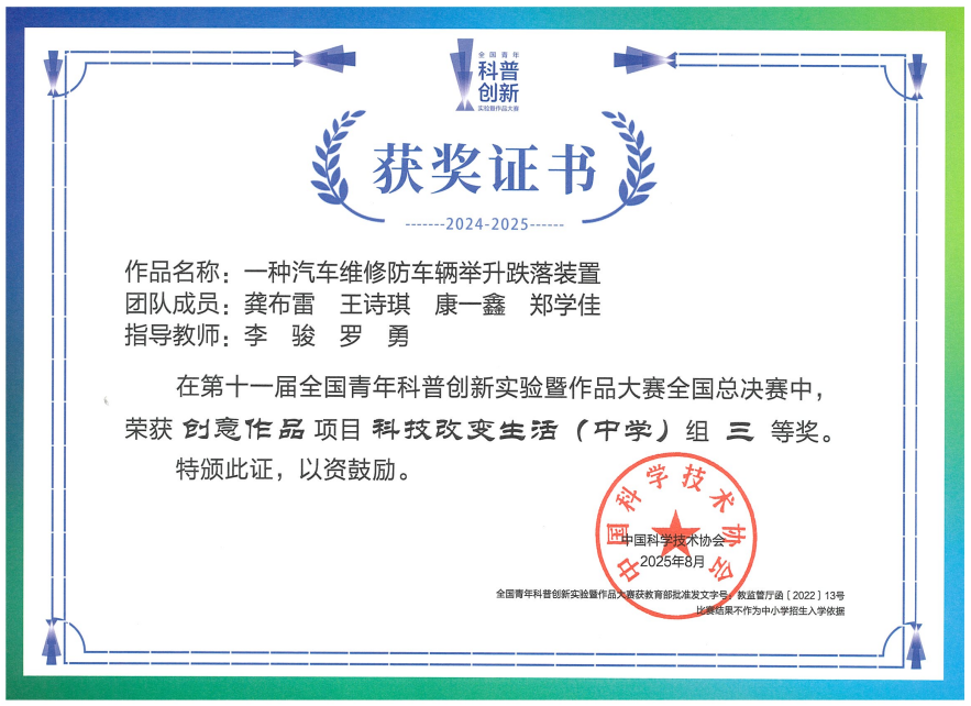 暑假里,由产教融合中心的李骏老师和智能汽车服务系的罗勇老师,带领上海南湖职业技术学院科创社团的龚布雷、康一鑫、王诗琪、郑学佳同学,晋级参加了第十一届全国青年科普创新实验暨作品大赛合肥赛场全国总决赛,师生携带《一种汽车维修防车辆举升跌落装置》,获得决赛三等奖,该赛项是学院科创团队首次参加的新赛项。