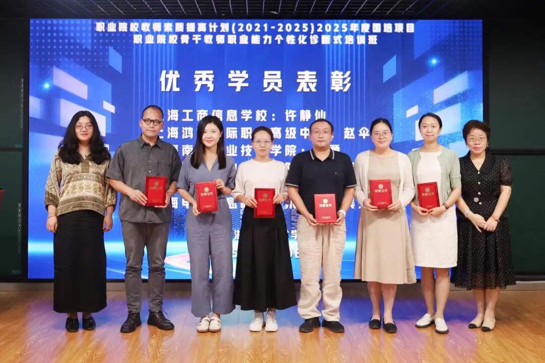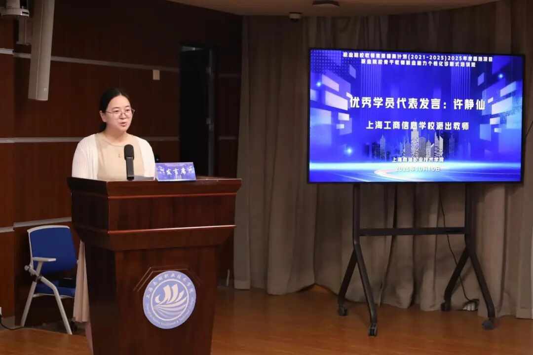 仪式中对表现突出的学员进行了表彰,授予“优秀学员”荣誉称号。上海工商信息学校派出教师许静仙作为优秀学员代表发言,她结合培训期间的收获与体会,分享如何在专家两轮诊断中实现自我突破,并表示将在今后的教学实践中持续探索、积极辐射培训成果。