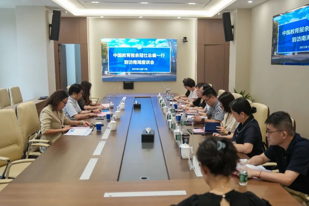 10月13日,中国教育报刊社副社长、中国教育报总编辑余冠仕一行调研上海南湖职业技术学院,围绕上海职业教育发展特色、人才培养创新模式、职业教育宣传等主题开展交流。中国教育报职教周刊主编翟帆,上海市教育委员会职教处副处长俞文达,中国教育报上海记者站记者任朝霞,虹口区教育局副局长、南湖职院党委书记李琰,南湖职院党委副书记、院长朱建柳,南湖职院副院长朱清清、胡跃忠,上海工艺美术职业学院校长宋磊,上海科创职业技术学院副校长藏鸿雁,上海市信息管理学校校长唐纪瑛,上海市工业技术学校校长张伟罡参与调研。