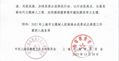 近日,中共上海市教育卫生工作委员会、上海市教育委员会公布了2025年上海市立德树人机制综合改革试点典型工作案例入选名单。上海南湖职业技术学院马院申报的案例《加强上海新型高职联合马院建设,提升马院内涵建设》成功入选。