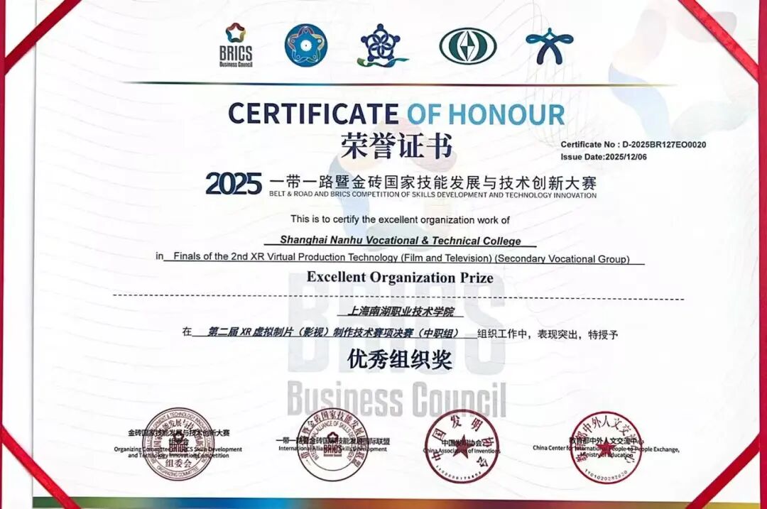 近日,2025年“一带一路暨金砖国家技能发展与技术创新大赛”系列赛项全国总决赛圆满落幕。上海南湖职业技术学院数字创意系表现亮眼,选派代表队分别征战首届AI辅助数字角色创新设计赛项与第二届XR虚拟制片(影视)制作技术赛项,历经多轮激烈角逐,最终在两大前沿赛项中均取得重要奖项,充分展现了学校在数字创意领域卓越的人才培养质量与教学实践成果。
