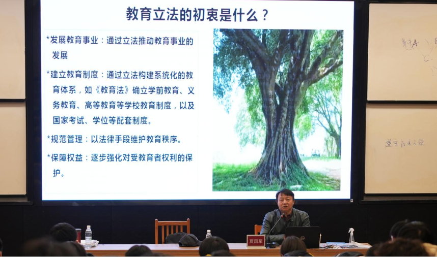 在阐述教育立法的初衷时,夏国军教授系统解读了《教育法》在我国教育体系构建中的重要作用。他表示,教育立法不仅推动教育事业制度化、系统化发展,更在规范教育管理、保障受教育者权利方面发挥着不可替代的功能。法律的健全与实施,为教育公平与质量提升奠定了坚实基础。