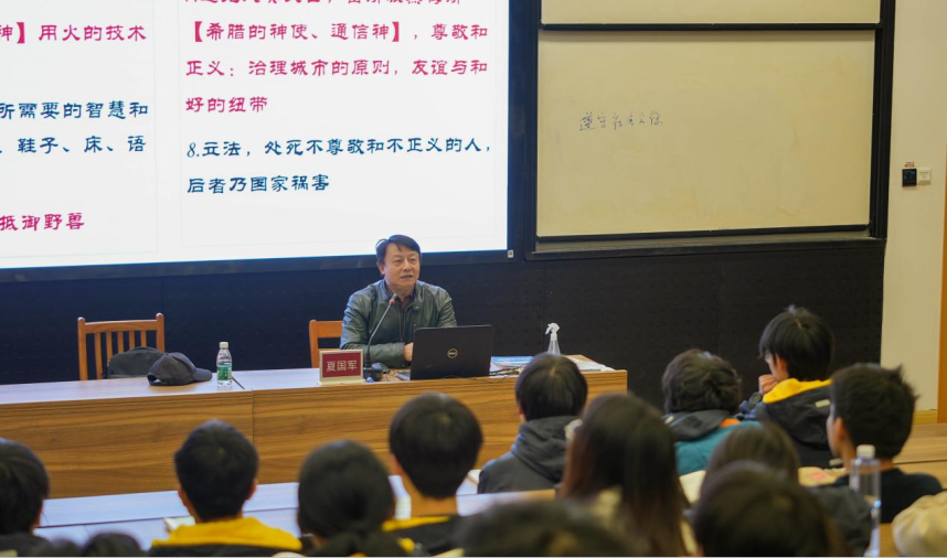 讲座伊始,夏国军教授从古希腊神话中的创世叙事入手,生动阐述了法律的起源与其社会功能。他引用宙斯派遣神使黑梅斯赐予人类“尊敬与正义”的故事,说明法律不仅是维护秩序的工具,更是文明存续与社会和谐的基石。夏教授指出,人类因共同生活而产生合作,也因合作需要规则,法律正是这种规则的最高体现,它防止自我伤害、促进公平正义,是社会赖以运行的根本保障。