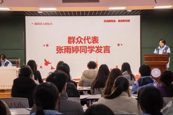 学生团委副书记李希宇同学讲解了团徽的组成与象征意义,宣读了《团员的义务与权利》。新团员代表护理2452班刘高冉表达了加入团组织的自豪,承诺以实际行动践行誓言;老团员代表智慧养老2431班吴雨晗分享了成长感悟,期待共同进步;群众代表数字媒体2451班张雨婷也送上了祝福,体现了团组织与青年的紧密联系。