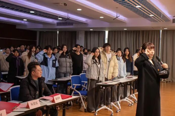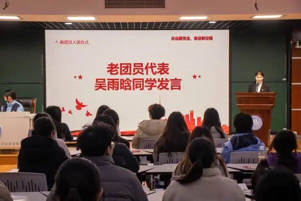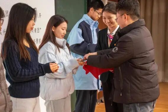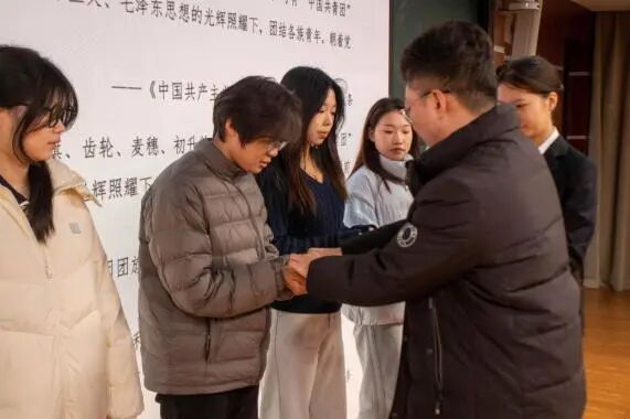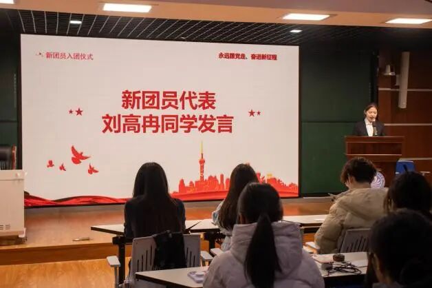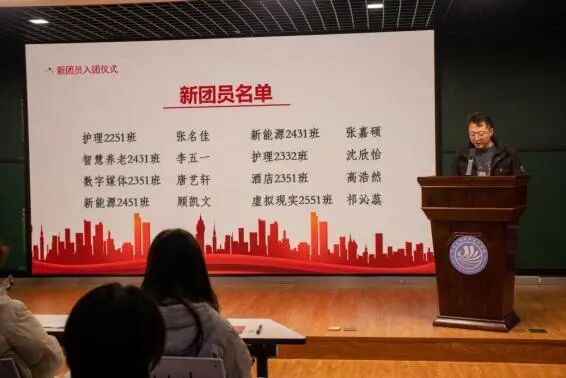 随后,团委副书记郝磊恒老师宣读了新团员名单,并为他们佩戴团徽、颁发团员证。团徽在胸前闪耀,标志着光荣,更意味着责任。展现了南湖学子昂扬向上、奋发有为的精神风貌。