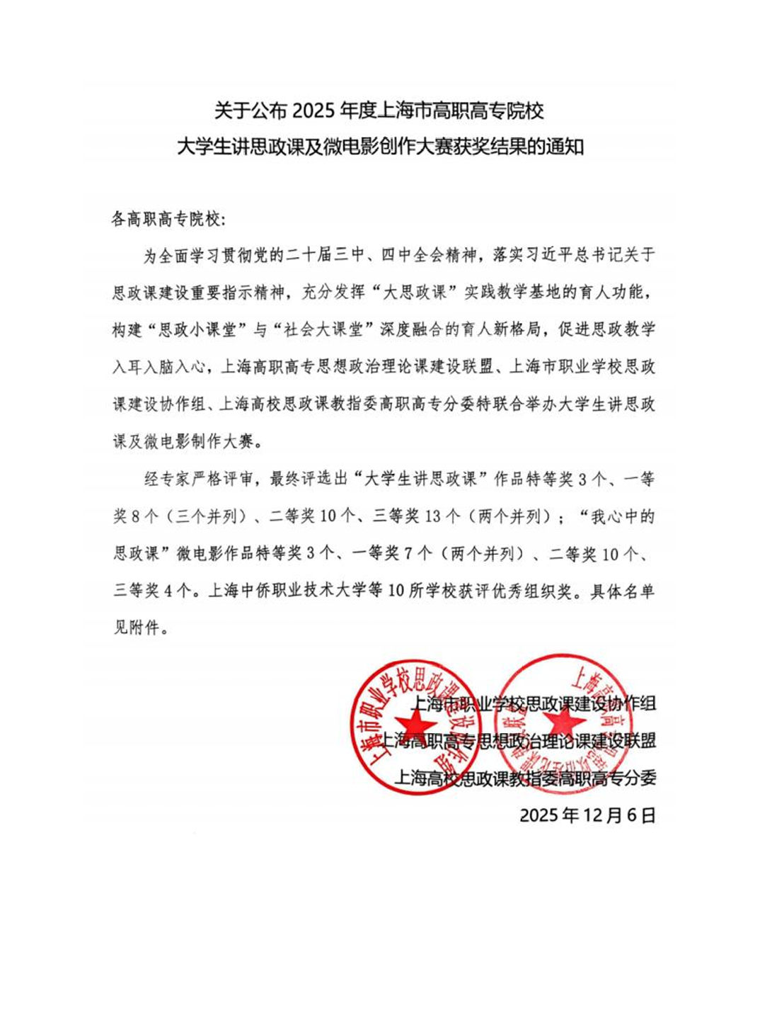 近日,由上海市职业学校思政课建设协作组、上海高职高专思想政治理论课建设联盟、上海高校思政课教指委高职高专分委联合主办的“2025年度上海市高职高专院校大学生讲思政课及微电影创作大赛”与“2025年上海市职业院校思想政治理论课教学案例比赛”结果正式揭晓。上海南湖职业技术学院马克思主义学院师生凭借深厚的专业积淀、创新的呈现形式与深刻的思政内核,在两项赛事中多点突破、捷报频传,斩获多个重要奖项,学院更获评优秀组织奖,充分展现了南湖人深耕思政教育的奋进姿态与育人成效。