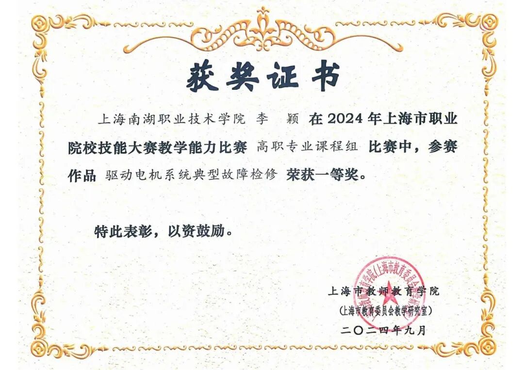 “打铁还需自身硬,教给学生一碗水,教师要有一桶活水。”这是李颖对职业教育的深刻理解。她坚持将“新能源汽车前沿技术”引入课堂,将“企业标准”融入教学。2025年,她深入上汽集团等行业龙头企业开展为期4个月的实践锻炼,攻克线控底盘、智能驾驶等前沿技术难题,迅速将企业真实案例转化为教学项目。厚积薄发,她在教学赛场上屡获佳绩。凭借《驱动电机系统典型故障检修》课程,她斩获2024年上海市职业院校技能大赛教学能力比赛一等奖,并获评2022年“南湖杯”职业技能大赛优秀指导教师。在提升自我的同时,她不忘育人初心,悉心辅导学生参加各类技能竞赛,统筹毕业生答辩,真正实现了“教学相长,师生共进”。