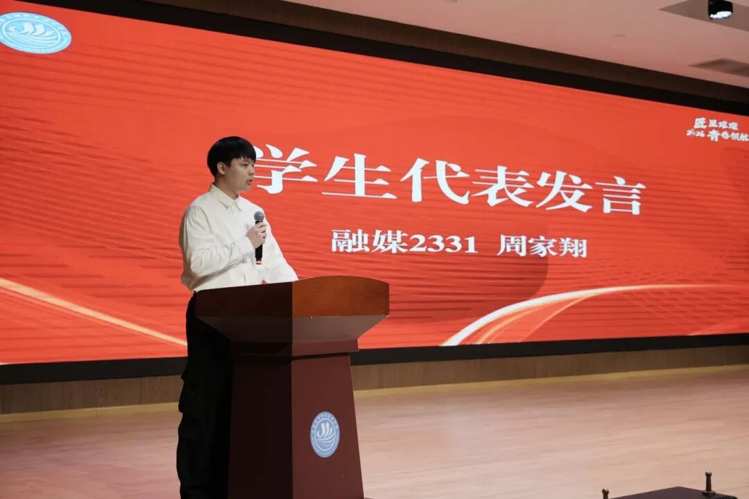 优秀学生代表逐一发言。融媒体2331班周家翔同学作为中华人民共和国第三届职业技能大赛优胜奖获得者、世界技能大赛梯队选手,分享了自己以技立身、逐梦前行的成长历程,他表示在未来的日子里他会继续精进自己的技能,锚定方向,精益求精,成就专业高度。