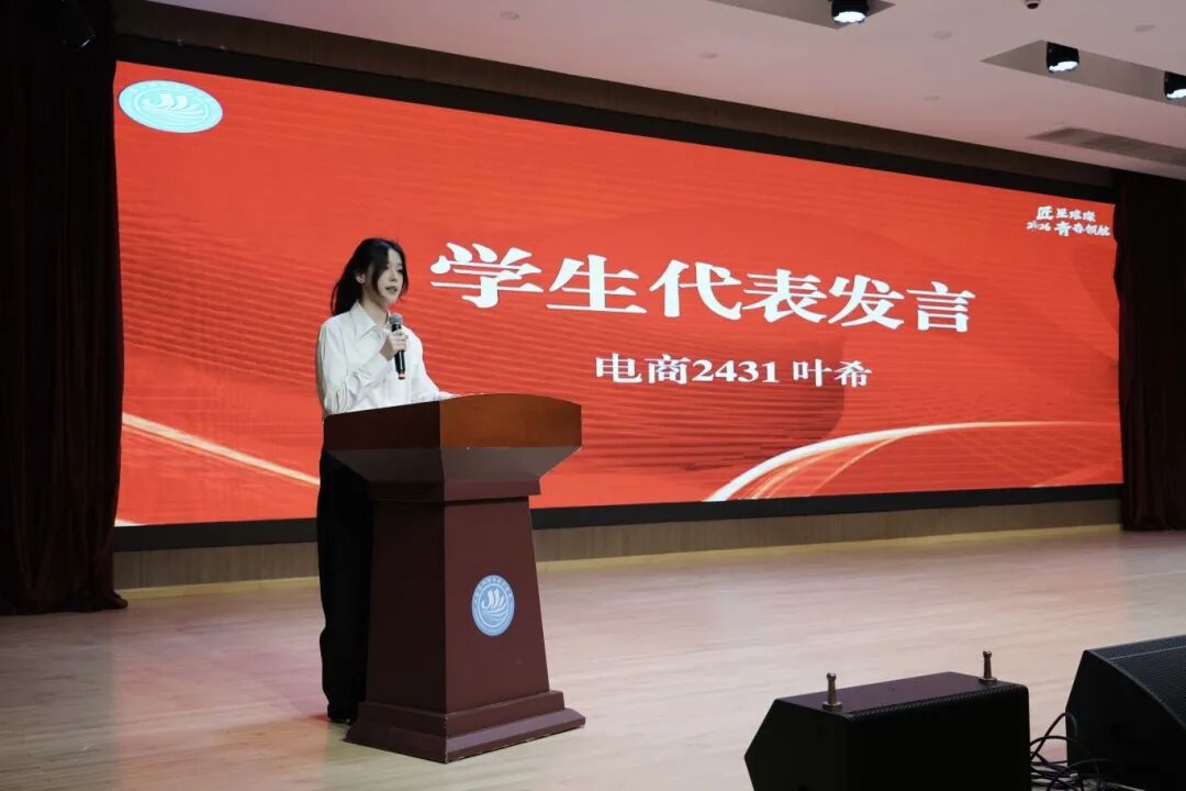直播电商2431班叶希同学作为学院三好学生代表发言,她回顾了自己过去一年的经历,分享了自身在学生工作、专业学习与社会实践中的成长历程。作为班级学习委员和社团社长,她积极履职助力集体进步;作为上海市“星光计划”技能大赛选手,融会贯通专业知识斩获佳绩;参与上海吴淞口国际邮轮港“非遗直播”助农活动,以专业技能赋能乡村振兴,全方位锤炼综合素养。她表示将以荣誉为新起点,持续精进,力争成为优质商旅人才,回馈学院与社会。