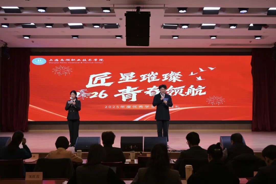 1月23日,上海南湖职业技术学院“匠星璀璨 青春领航”2025年度优秀学生颁奖典礼在5G实训中心二楼会议室隆重举行。虹口区教育局副局长、学院党委书记李琰,学院党委副书记、院长朱建柳,学院党委副书记、纪委书记赵锋,学院副院长朱清清、胡跃忠,学院工会主席、组织人事处主任杨柳出席本次活动,相关职能部门及各系部负责人、中高职贯通联合体单位代表、家长代表与获奖学生代表齐聚一堂,共同见证青春荣耀时刻,共话成长成才之路。