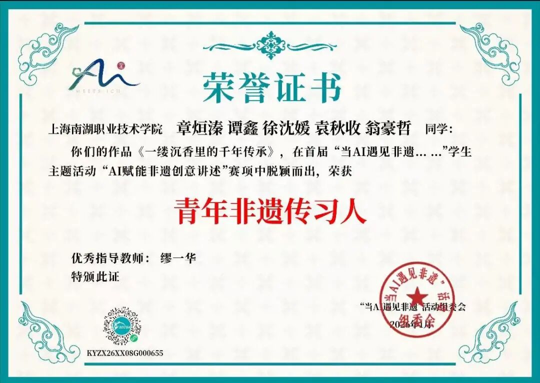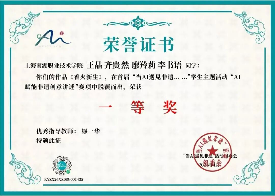 此次获奖不仅是对南湖师生专业能力与创新精神的充分肯定,更是学校深耕职业教育、推动产教融合的又一丰硕成果。未来,上海南湖职业技术学院将继续深化教育教学改革,鼓励更多师生投身非遗传承与科技创新实践,探索“AI+非遗”的更多可能,培养更多兼具文化素养与技术能力的高素质人才,为中华优秀传统文化的活态传承贡献“南湖力量”!