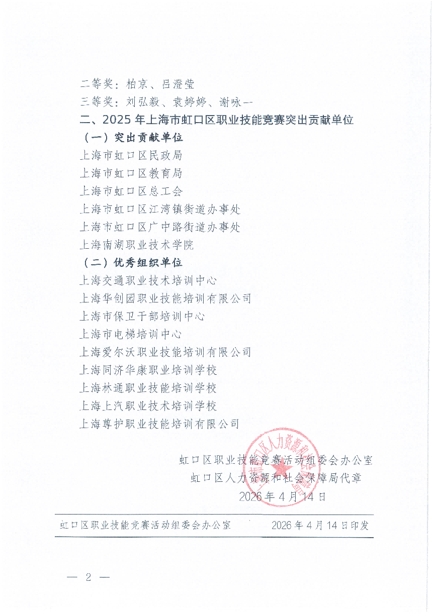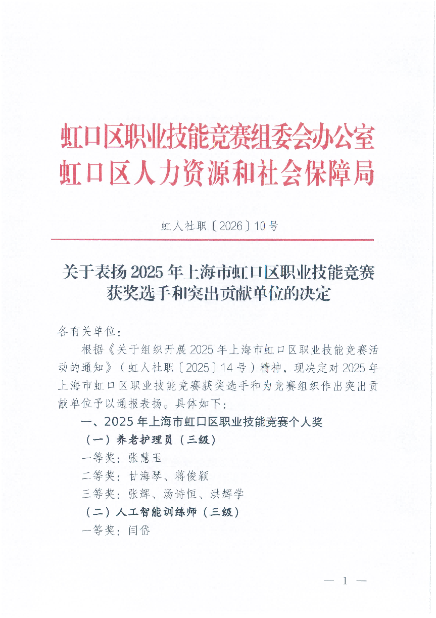 近日,虹口区职业技能竞赛组委会办公室、虹口区人力资源和社会保障局联合发布通报,对2025年上海市虹口区职业技能竞赛获奖选手及突出贡献单位予以表扬。上海南湖职业技术学院荣获突出贡献单位,学院继续教育学院交培中心获评优秀组织单位。